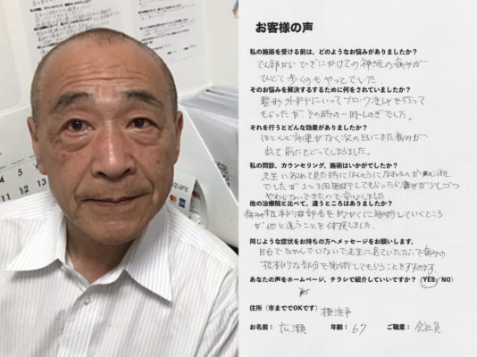 こんにちは! 横浜市戸塚区の腰痛専門整体院AIN-アイン- 代表の志村嘉洋です。 当院の患者様の声をご紹介させていただきます。 長年の