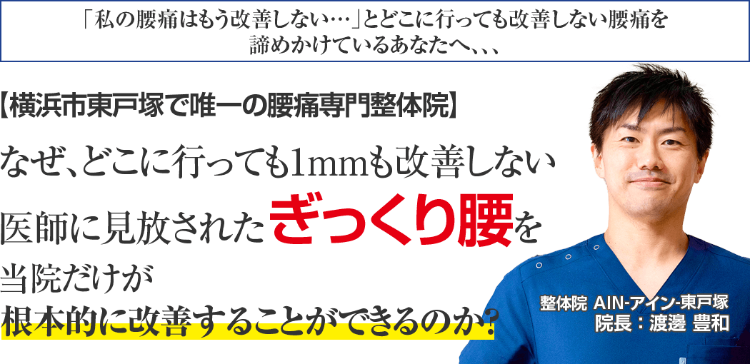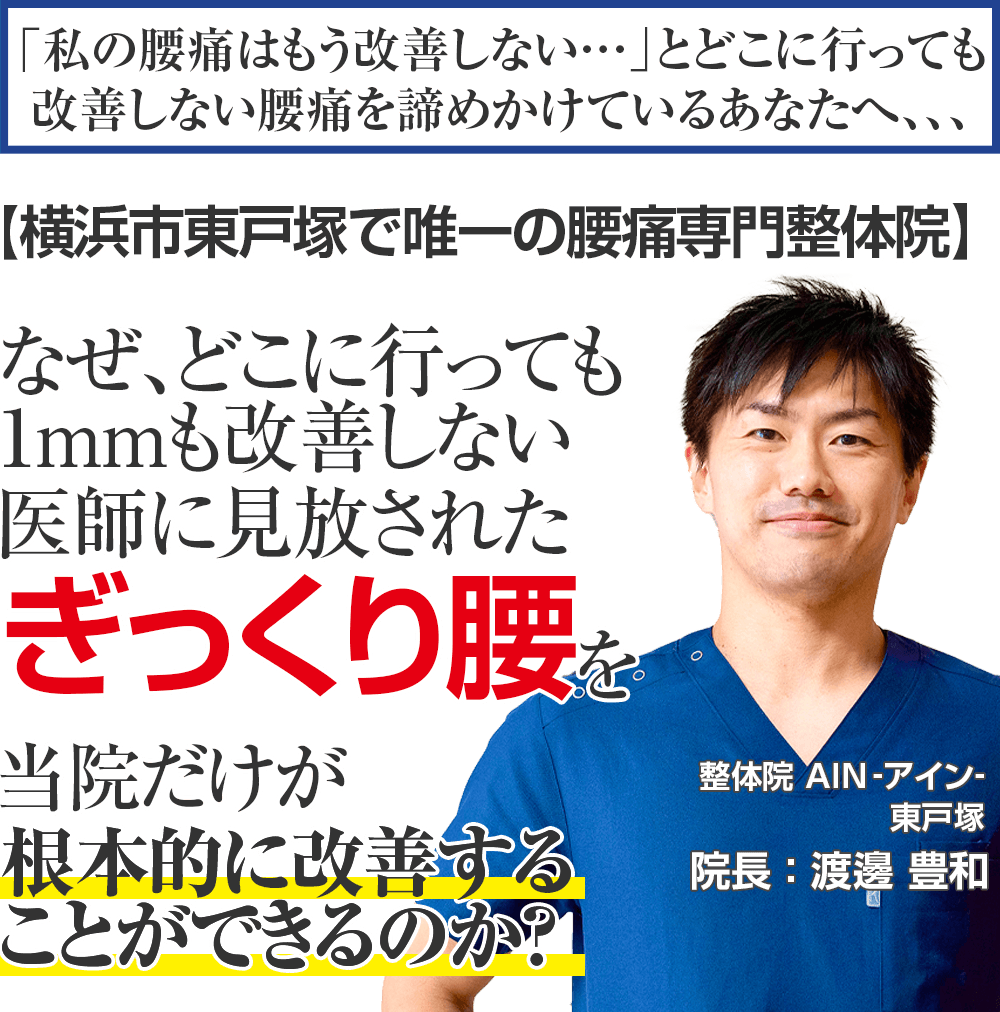 10年以上の臨床経験があり、あなたの悩み続けて来た辛い症状に真正面から向き合ってくれる唯一のぎっくり腰専門整体院 AIN-アイン-東戸塚に来院して辛い痛みを我慢することなく生活できることを手に入れる道。