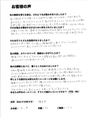 じっくりとお話をする事が出来て、細かい事も聞いてもらえました。例えば、自分の親が股関節症で手術をしているのですが遺伝的に股関節も注意しなければいけない事がわかったし、自分では気がつかなかった痛みの原因や注意点がわかりました。