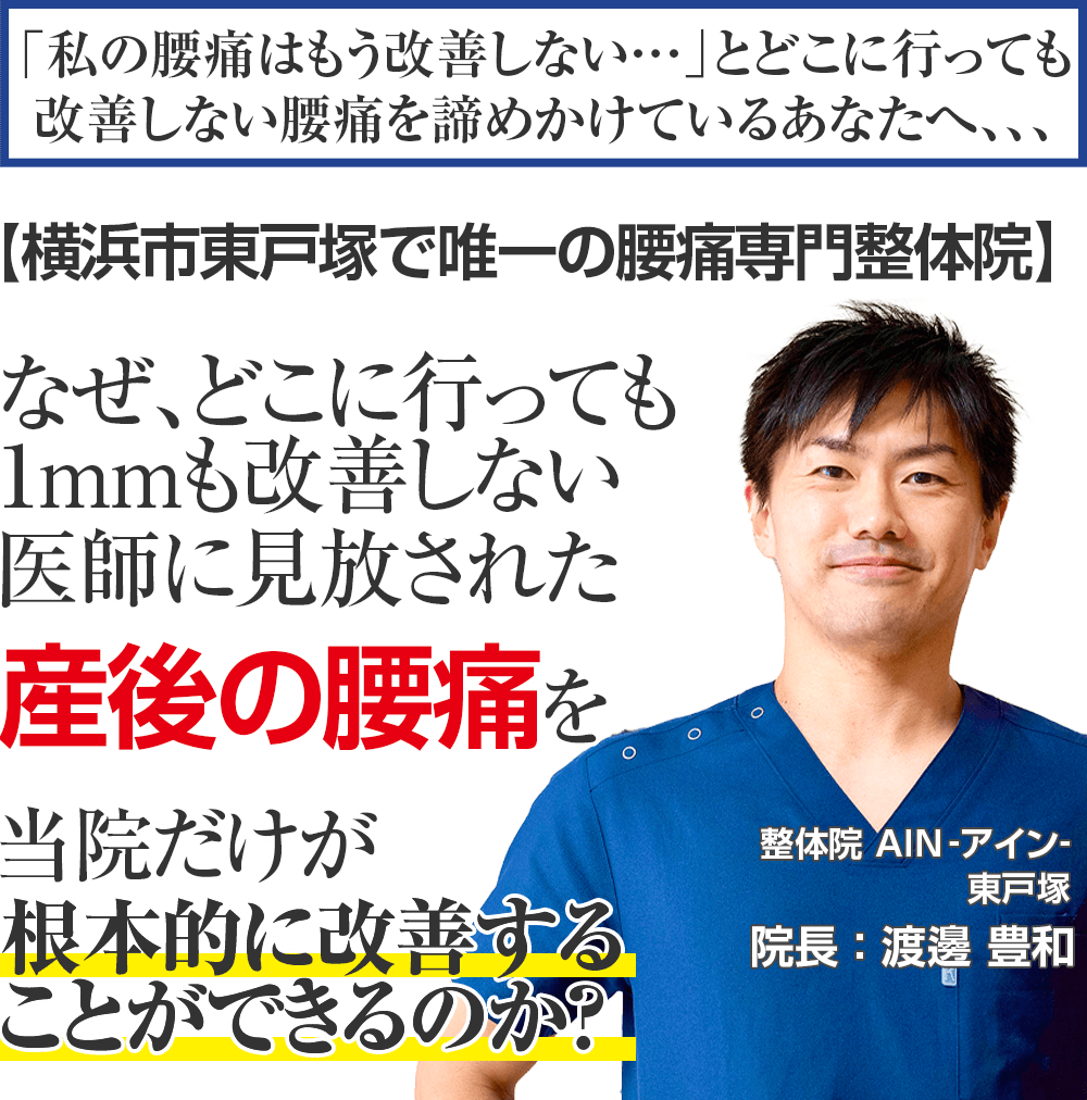 10年以上の臨床経験があり、あなたの悩み続けて来た辛い症状に真正面から向き合ってくれる唯一の産後の腰痛専門整体院 AIN-アイン-東戸塚に来院して辛い痛みを我慢することなく生活できることを手に入れる道。
