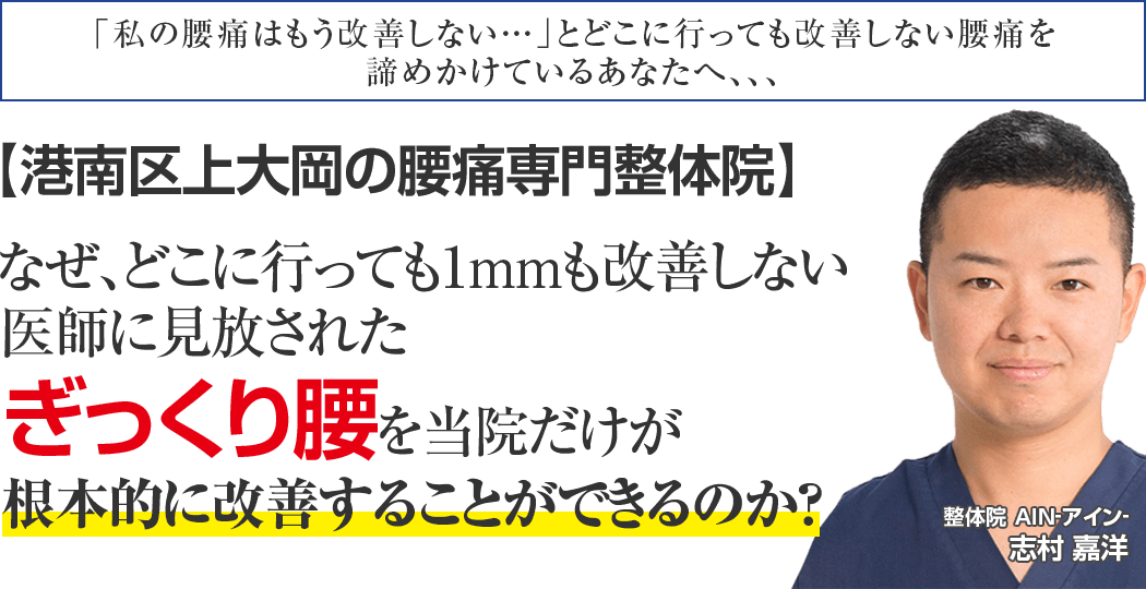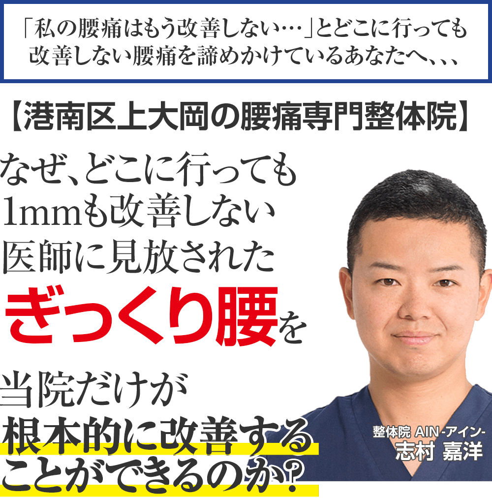 10年以上の臨床経験があり、あなたの悩み続けて来た辛い症状に真正面から向き合ってくれる唯一のぎっくり腰専門整体院 AIN-アイン-上大岡に来院して辛い痛みを我慢することなく生活できることを手に入れる道。