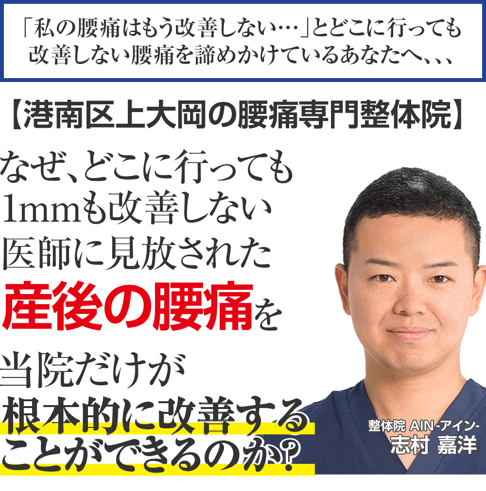 10年以上の臨床経験があり、あなたの悩み続けて来た辛い症状に真正面から向き合ってくれる唯一の産後の腰痛専門整体院 AIN-アイン-上大岡に来院して辛い痛みを我慢することなく生活できることを手に入れる道。