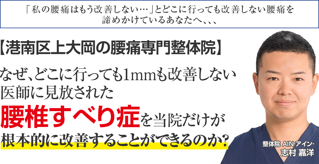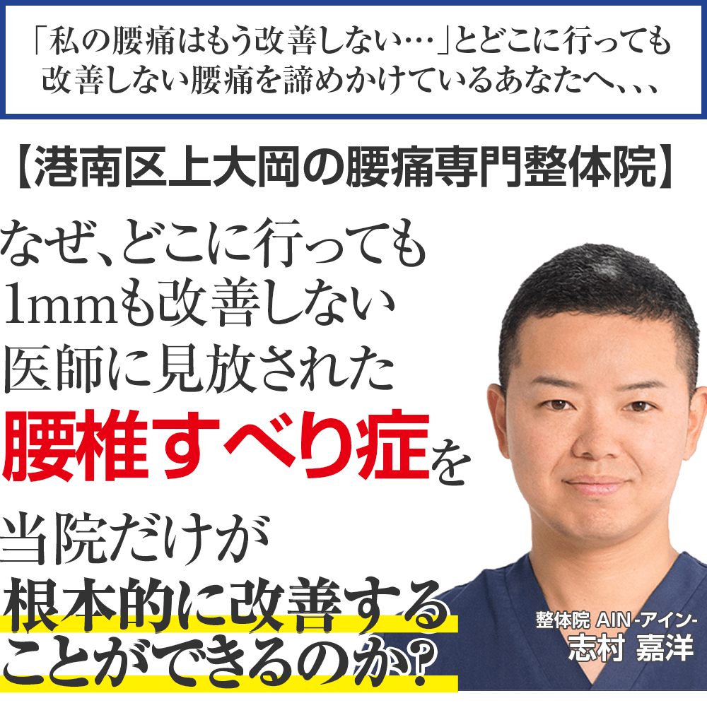 10年以上の臨床経験があり、あなたの悩み続けて来た辛い症状に真正面から向き合ってくれる唯一の腰椎すべり症専門整体院 AIN-アイン-上大岡に来院して辛い痛みを我慢することなく生活できることを手に入れる道。