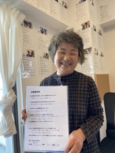 こんなに痛みがあっても改善するものなのかしら?と思っていましたが、1回目の施術が終わって帰りには楽になっていました。やはりここに頼って良かったと思いました。先生を信じて良くなるまで続けようと思いました。