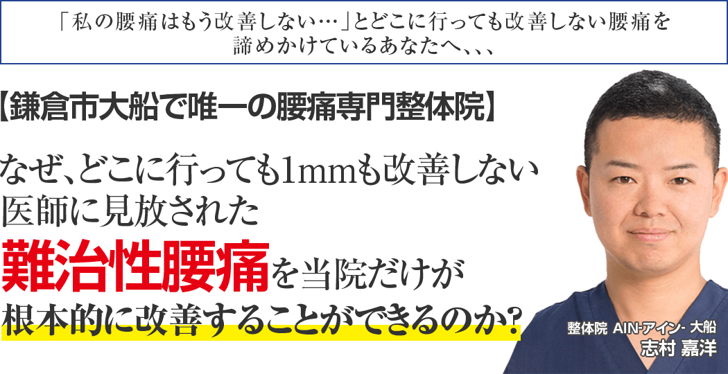 10年以上の臨床経験があり、あなたの悩み続けて来た辛い症状に真正面から向き合ってくれる唯一の腰痛専門整体院 AIN-アイン-大船に来院して辛い痛みを我慢することなく生活できることを手に入れる道。