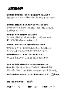こんなに痛みがあっても治るものなのかしら?と思っていましたが、1回目の施術が終わって帰りには楽になっていました。やはりここに頼って良かったと思いました。先生を信じて良くなるまで続けようと思いました。