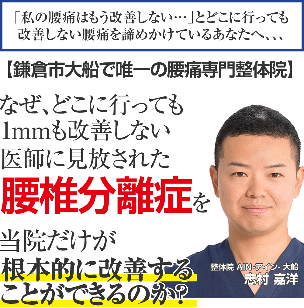 10年以上の臨床経験があり、あなたの悩み続けて来た辛い症状に真正面から向き合ってくれる唯一の腰椎分離症専門整体院 AIN-アイン-大船に来院して辛い痛みを我慢することなく生活できることを手に入れる道。